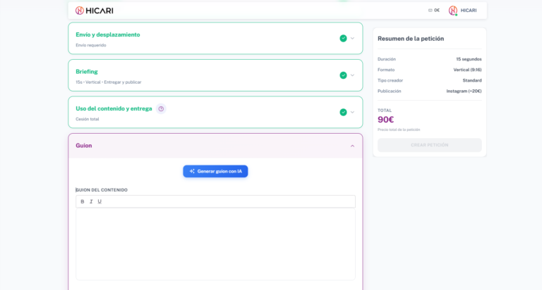 La plataforma es 100% gratuita. A diferencia de otras plataformas de UGC, el acceso a HICARI, a ver todos los creadores UGC y funcionalidades de la plataforma es gratis. El único coste que tendrás es cuando pagues por vídeo. En HICARI solo pagas por lo que te llevas.