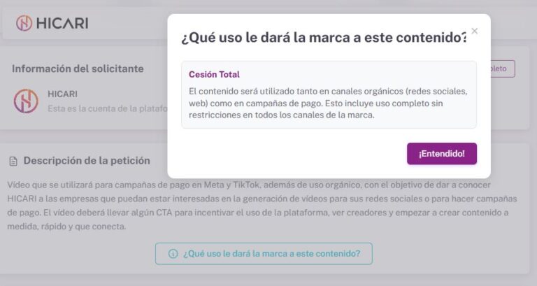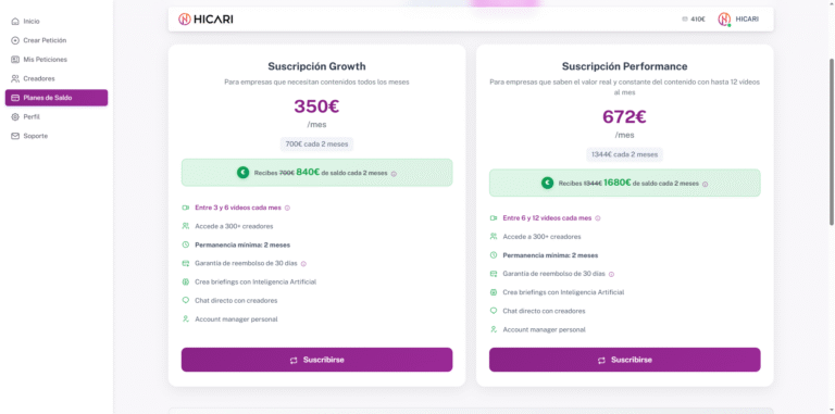 HICARI no es solo una agencia: somos una plataforma UGC de creadores + gestión personalizada con account manager (en el caso de contratar: ‘Plan Performance’, ‘Suscripción Growth‘ o ‘Suscripción Performance‘ . Esto significa que tienes acceso directo a ver y contratar a un pool enorme de creadores, con transparencia total en precios y procesos, y además un equipo que te acompaña para asegurar que el contenido se ajusta a tus necesidades y funciona en campañas reales.