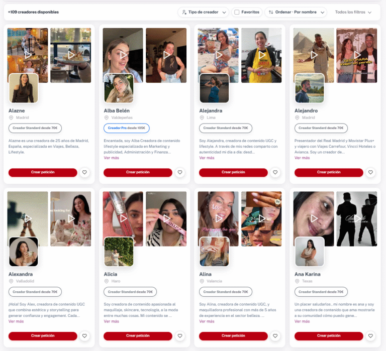 Creators | 🌍 Gran pool de creadores UGC (diversidad de perfiles, edades, estilos), accesibles desde la plataforma. | 👤 Menos variedad y menos transparencia, se proponen perfiles que tienen relación con la agencia. |